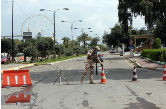3月18日,在伊拉克巴格達(dá),一名伊拉克安全人員走在空蕩的街頭。新華社發(fā)