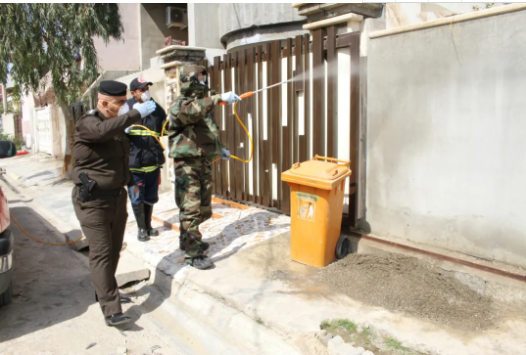 3月8日,在伊拉克北部基爾庫(kù)克省,醫(yī)療人員為新冠肺炎確診病例所在家庭的房屋消毒。新華社發(fā)