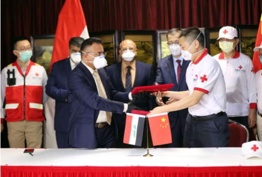 3月16日,在伊拉克巴格達(dá),中國(guó)專家組領(lǐng)隊(duì)與巴格達(dá)醫(yī)學(xué)城代表交接證書(shū)。新華社發(fā)