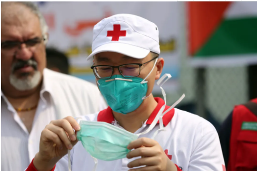 3月16日,在伊拉克巴格達(dá),中國(guó)醫(yī)療專家展示口罩使用方法。新華社發(fā)