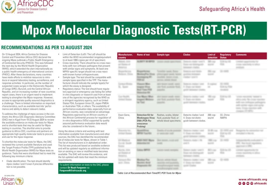 隨著剛果民主共和國(guó)(DRC)、布隆迪和中非共和國(guó)疑似病例數(shù)量的激增,全球衛(wèi)生機(jī)構(gòu)正緊密合作,以確保各國(guó)能夠迅速且準(zhǔn)確地檢測(cè)猴痘病毒。為解決非洲猴痘檢測(cè)面臨的挑戰(zhàn)、加強(qiáng)疫情的應(yīng)對(duì)措施,非洲疾病預(yù)防控制中心診斷咨詢委員會(huì)(DAC)于2024年8月19日至23日在基加利召開緊急會(huì)議,審查并篩選出首批推薦的猴痘分子診斷試劑。這一推薦旨在指導(dǎo)采購(gòu)決策,確保各國(guó)能夠采用高質(zhì)量的分子檢測(cè)方法,有效應(yīng)對(duì)猴痘疫情的挑戰(zhàn)。經(jīng)過評(píng)估和審查,達(dá)安基因的猴痘檢測(cè)試劑——猴痘病毒核酸檢測(cè)試劑盒(熒光PCR法)入選首批推薦名單。非洲疾病預(yù)防控制中心和世界衛(wèi)生組織呼吁所有國(guó)家加強(qiáng)對(duì)猴痘疫情的監(jiān)測(cè)和應(yīng)對(duì)措施,同時(shí)強(qiáng)調(diào)了采用經(jīng)過驗(yàn)證的檢測(cè)方法的重要性。此次入選是對(duì)達(dá)安基因在分子診斷領(lǐng)域?qū)I(yè)能力和技術(shù)實(shí)力的肯定,同時(shí)也將為全球抗擊猴痘疫情提供強(qiáng)有力的支持。