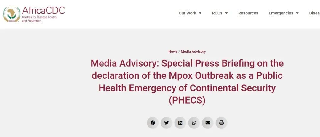 [1]Africa CDC.Media Advisory: Special Press Briefing on the declaration of the Mpox Outbreak as a Public Health Emergency of Continental Security (PHECS)  August 12, 2024,fromthe World Wide Web:https://africacdc.org/news-item/media-advisory-special-press-briefing-on-the-continental-declaration-of-mpox-outbreak/