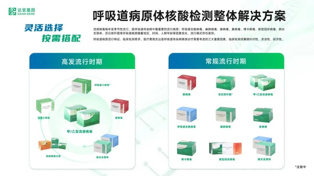 為了滿足呼吸道病原體的臨床診療需求,達(dá)安基因不斷豐富該產(chǎn)品系列,從病原體流行特點(diǎn)、臨床檢測需求和醫(yī)療費(fèi)用支出三個(gè)方面著手,形成了日臻完善的呼吸道病原體核酸檢測整體解決方案,可根據(jù)診療需求進(jìn)行靈活選擇單檢或組合檢測,對(duì)于呼吸道感染性疾病的精準(zhǔn)防控、診斷、提高治療效率具有重要意義。