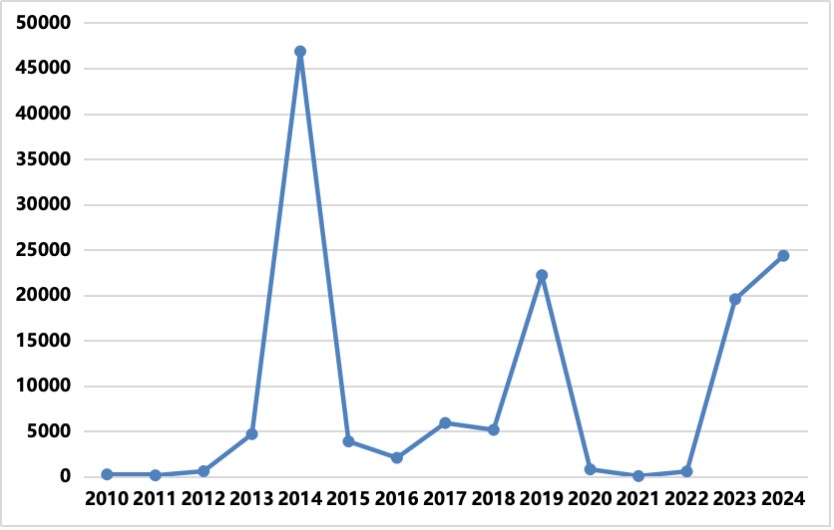 2010-2024年中國(guó)登革熱病例報(bào)告數(shù)