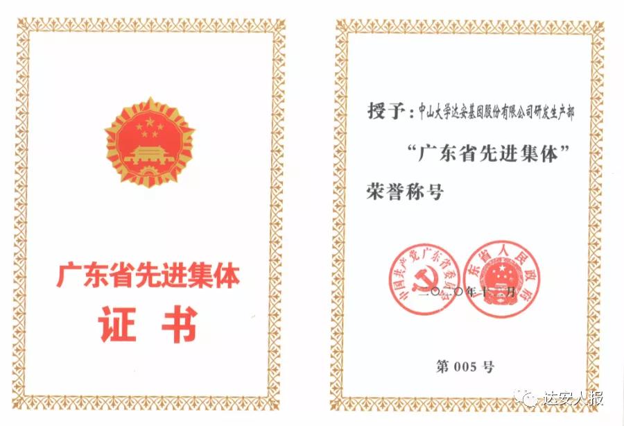 2020年12月2日,2020年廣東省勞動模范先進工作者和先進集體表彰大會在廣州舉行,會議對399名省勞動模范、先進工作者和100個先進集體進行表彰。受表彰的省勞模中,87人參與抗疫;受表彰的省先進集體中,25個參與抗疫。中山大學達安基因股份有限公司研發(fā)生產(chǎn)部被授予“廣東省先進集體”榮譽稱號。這體現(xiàn)了廣東省委、省政府對達安基因在此次“戰(zhàn)疫”過程中所作貢獻的充分肯定。