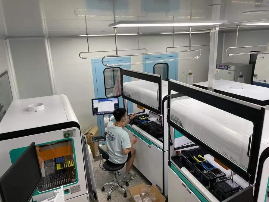 這些快檢設(shè)備,可以在8小時(shí)內(nèi)達(dá)到1萬人份的檢測(cè)量,大大緩解了目前因檢測(cè)能力不足而帶來的壓力。在應(yīng)急抗疫上,達(dá)安基因還對(duì)“移動(dòng)方艙實(shí)驗(yàn)室”進(jìn)行了技術(shù)指導(dǎo)工作。移動(dòng)方艙實(shí)驗(yàn)室,可以就地采樣、就地檢測(cè),減少了往返實(shí)驗(yàn)室的時(shí)間,大大提高了檢測(cè)速度。5月29日一大早,技術(shù)人員陳紅光、李雄湛就趕赴佛山,解決移動(dòng)方艙的技術(shù)難題。比如,實(shí)驗(yàn)室的門比較窄,生物安全柜難以入艙,他們兩人就使用專業(yè)工具拆卸艙門。第二天凌晨四點(diǎn),終于完成了各種儀器的安裝調(diào)試。早上九點(diǎn)半,正式投入使用。在他們的支持下,如今,一個(gè)移動(dòng)方艙實(shí)驗(yàn)室的日檢測(cè)量可達(dá)3000-5000人份,提高了廣州市及周邊地區(qū)的核酸檢測(cè)能力。