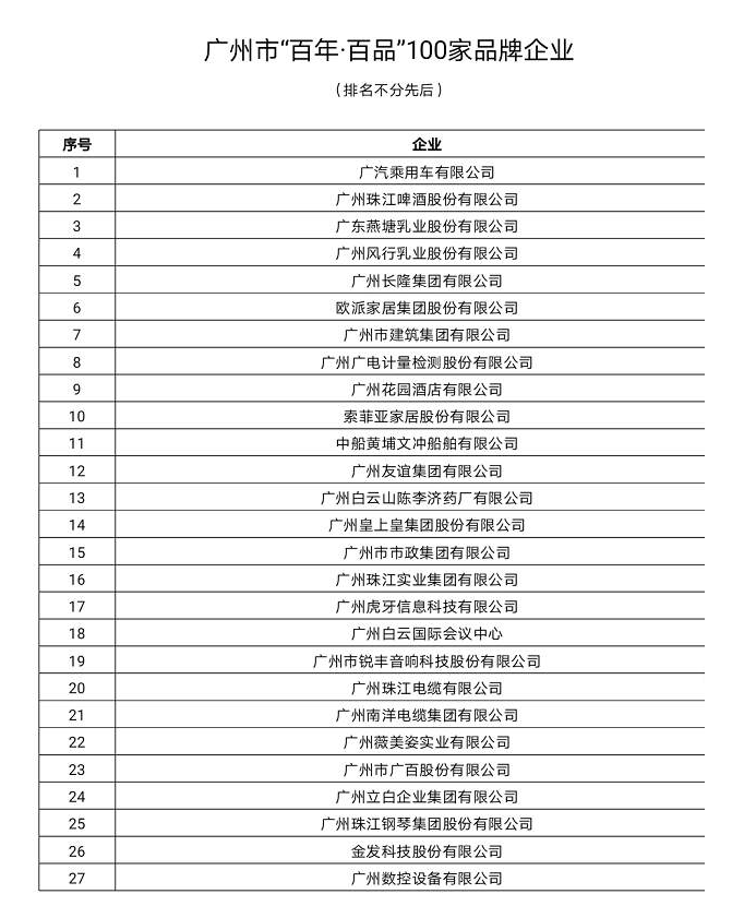 7月6日,廣州市質(zhì)量強(qiáng)市工作領(lǐng)導(dǎo)小組辦公室發(fā)布廣州市“百年·百品”100家品牌企業(yè)名單,來(lái)自廣州本土的100家品牌企業(yè)入選。這是廣州全面展示質(zhì)量品牌建設(shè)成就,獻(xiàn)禮中國(guó)共產(chǎn)黨百年華誕,推動(dòng)高質(zhì)量發(fā)展、建設(shè)質(zhì)量強(qiáng)市的一次重要行動(dòng)。