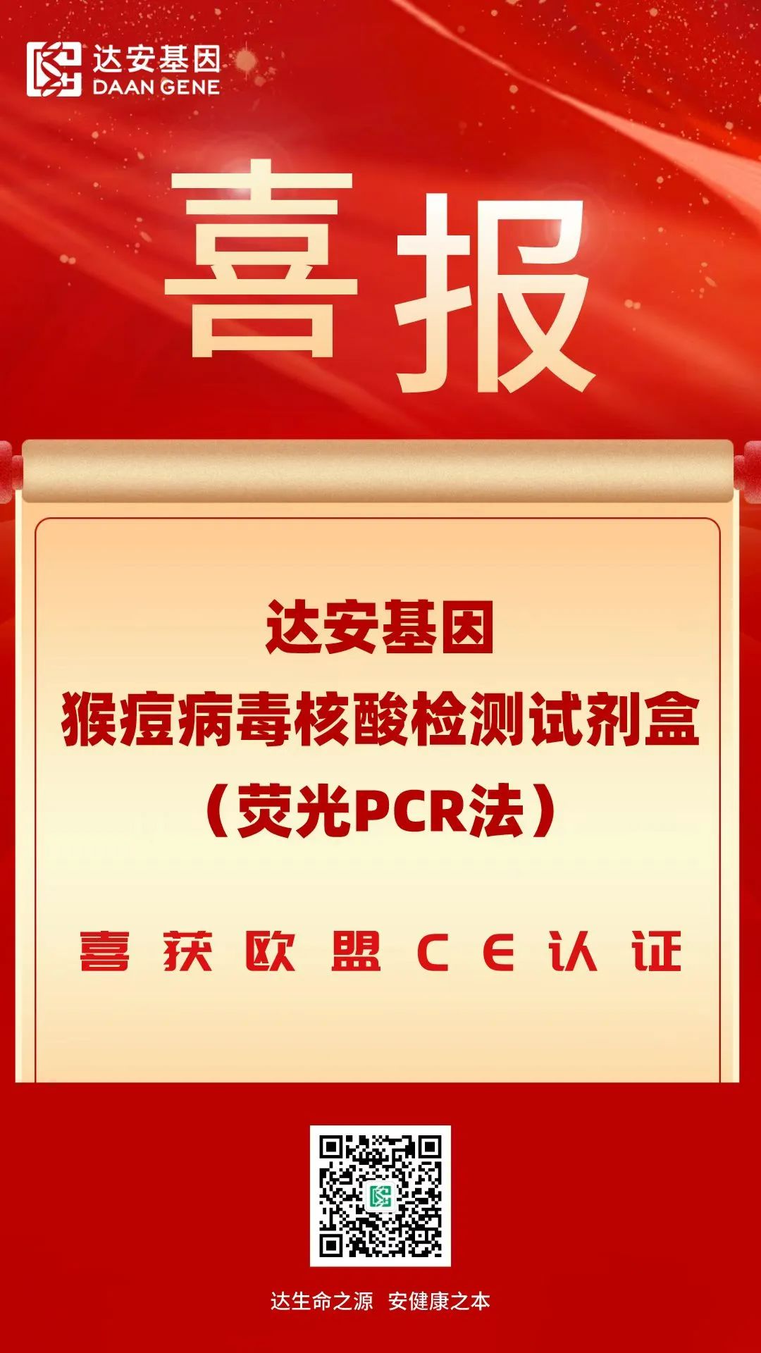 5月23日晚,達(dá)安基因研發(fā)的“猴痘病毒核酸檢測(cè)試劑盒(熒光PCR法)”獲得歐盟CE準(zhǔn)入資格!這意味著該試劑盒可在歐盟國(guó)家以及認(rèn)可歐盟CE認(rèn)證的國(guó)家進(jìn)行銷售。
