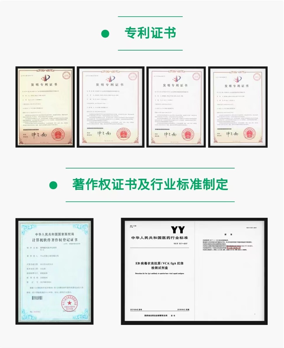 中山生物于1991年7月成立,是一家集研發(fā)、生產(chǎn)、銷售于一體的體外診斷試劑高新技術(shù)企業(yè),是達(dá)安基因的全資子公司。據(jù)中山生物介紹,公司主要研制各類病毒檢測(cè)試劑盒產(chǎn)品,主要產(chǎn)品包括酶聯(lián)免疫法產(chǎn)品(ELISA)、POCT產(chǎn)品、微注凝膠法產(chǎn)品及保存液四大類體外診斷試劑,是國(guó)內(nèi)較早通過(guò)國(guó)家藥品GMP、ISO13485、國(guó)家體外診斷試劑質(zhì)量管理體系認(rèn)證的企業(yè)。目前公司擁有醫(yī)療器械注冊(cè)證41項(xiàng),其中三類醫(yī)療器械29項(xiàng)(膠體金產(chǎn)品11項(xiàng)),藥品證書(shū)4項(xiàng);持有專利47項(xiàng)(病毒檢測(cè)核心發(fā)明專利近10項(xiàng)),是國(guó)家知識(shí)產(chǎn)權(quán)管理貫標(biāo)單位。中山生物的EB病毒系列檢測(cè)試劑盒,可用于EB病毒抗體血清學(xué)檢測(cè)。公司產(chǎn)品自2012年5月批準(zhǔn)上市至今,受益人群多達(dá)3200萬(wàn)人次,產(chǎn)生了良好的經(jīng)濟(jì)與社會(huì)效益。