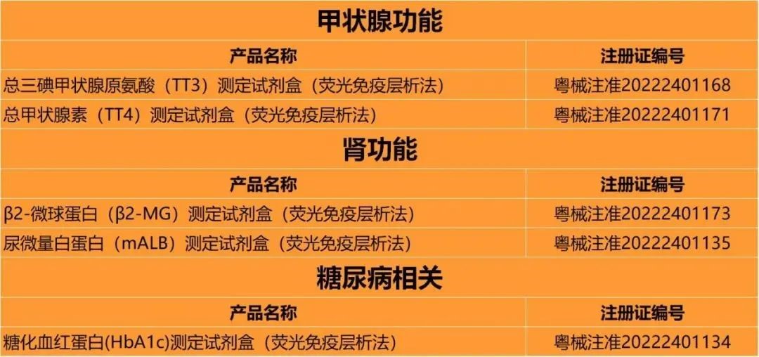 本次獲證的甲狀腺疾病檢測試劑為總?cè)饧谞钕僭彼幔═T3)測定試劑盒(熒光免疫層析法) 和總甲狀腺素(TT4)測定試劑盒(熒光免疫層析法);腎臟類疾病檢測試劑主要為β2-微球蛋白(β2-MG)測定試劑盒(熒光免疫層析法)、和尿微量白蛋白(mALB)測定試劑盒(熒光免疫層析法);糖尿病等疾病檢測試劑主要是糖化血紅蛋白(HbA1c)測定試劑盒(熒光免疫層析法)。