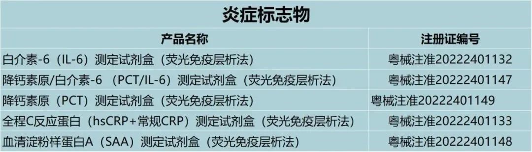 本次獲證的感染性疾病檢測試劑主要包括:白介素-6(IL-6)測定試劑盒(熒光免疫層析法)、降鈣素原/白介素-6 (PCT/IL-6)測定試劑盒(熒光免疫層析法)、降鈣素原(PCT)測定試劑盒(熒光免疫層析法) 、全程C反應(yīng)蛋白(hsCRP+常規(guī)CRP)測定試劑盒(熒光免疫層析法)、血清淀粉樣蛋白A(SAA)測定試劑盒(熒光免疫層析法)等產(chǎn)品。