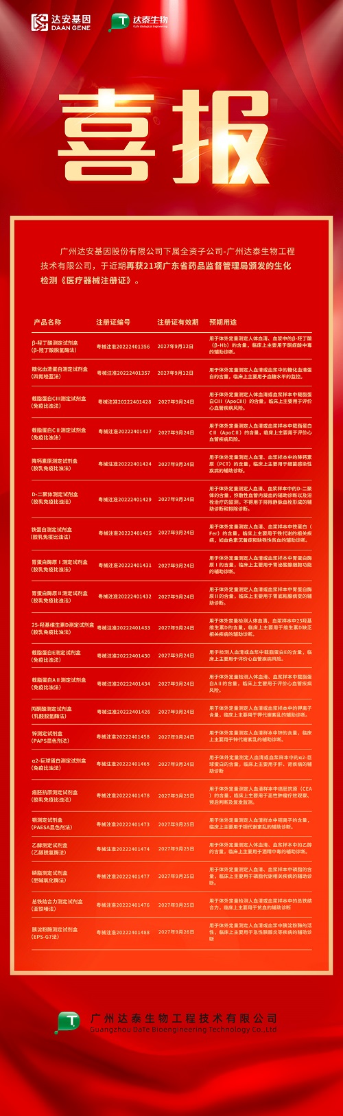 喜報(bào) | 達(dá)安基因下屬全資子公司—達(dá)泰生物再獲21項(xiàng)《醫(yī)療器械注冊(cè)證》
