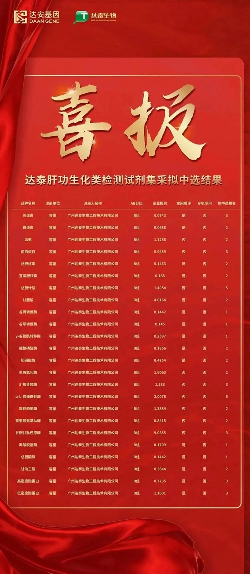 喜報(bào) | 達(dá)安基因全資子公司達(dá)泰生物全面中標(biāo)肝功生化類檢測(cè)試劑省際聯(lián)盟集采