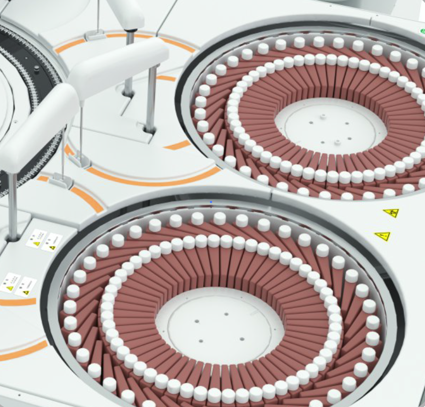 加樣針獨(dú)立非同步進(jìn)行,有效提升測試速度,雙盤設(shè)計(jì),共有168個(gè)試劑位,單盤故障時(shí)不影響另一個(gè)盤的正常運(yùn)行。