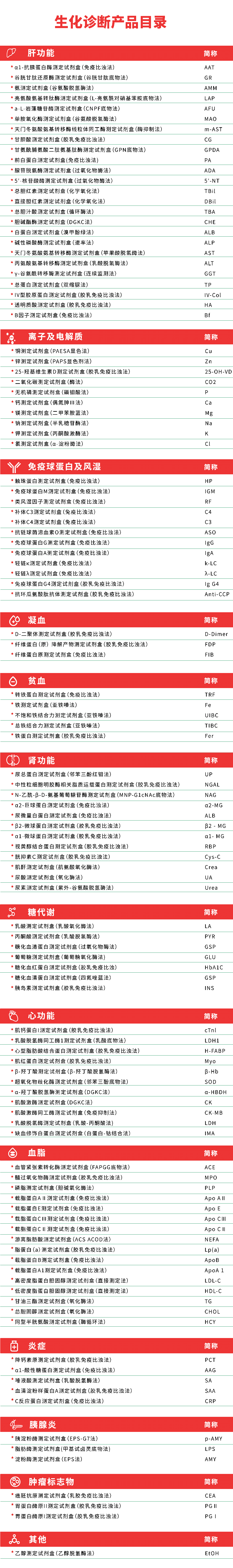 此外,達(dá)安基因目前已獲證的配套生化試劑涵蓋肝功能、腎功能、心功能、離子及電解質(zhì)、免疫球蛋白及風(fēng)濕、凝血、貧血等總計(jì)114項(xiàng),試劑性能優(yōu)越,品類豐富,備貨充足。以下是生化診斷試劑產(chǎn)品目錄: