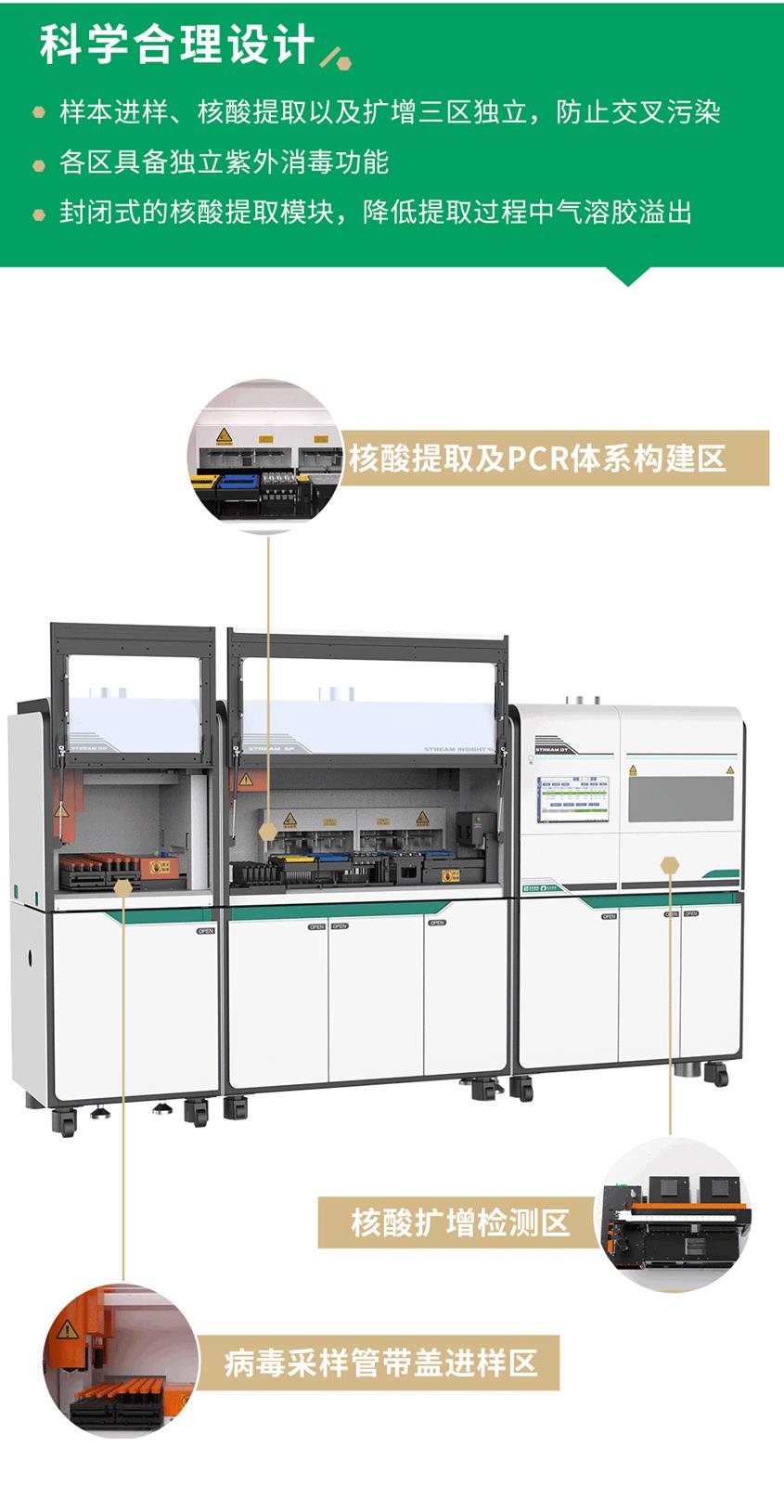 Stream Insight96集成核酸檢測全流程,自動化完成病毒采樣管開關(guān)蓋、采血管原管脫蓋上機、信息錄入、核酸提取、PCR檢測,實現(xiàn)樣本進結(jié)果出。三區(qū)獨立,全程自動化運行,一機一人,即可完成PCR檢測整個過程,大幅節(jié)省人力。