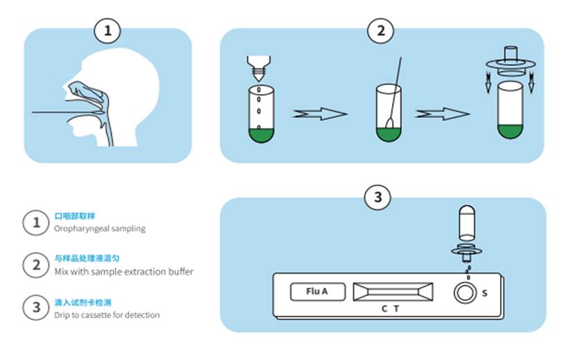 甲型流感病毒抗原檢測試劑操作十分簡便。 根據(jù)試劑說明書,只需將采集樣本后的咽拭子立即置于采樣管中,拭子頭應(yīng)在保存液中充分混勻,同時用手隔著采樣管外壁擠壓拭子頭,確保樣本充分洗脫于采樣管中。